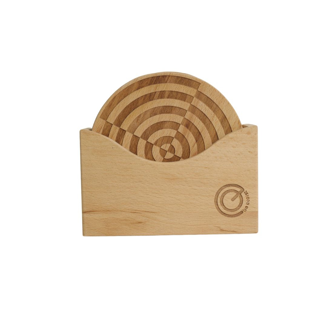 - A steam beech wooden coaster set with 6 different geometric line patterns.